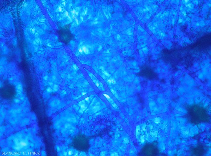 A l'aide d'un microscope photonique, on peut observer le mycélium caractéristique de <i>Rhizoctonia solani</i>.