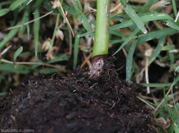 détail de lésions nécrotiques brunes localisées à la base de la tige d'un pied de pomme de terre. <i><b>Rhizoctonia solani</i></b> (rhizoctone brun)