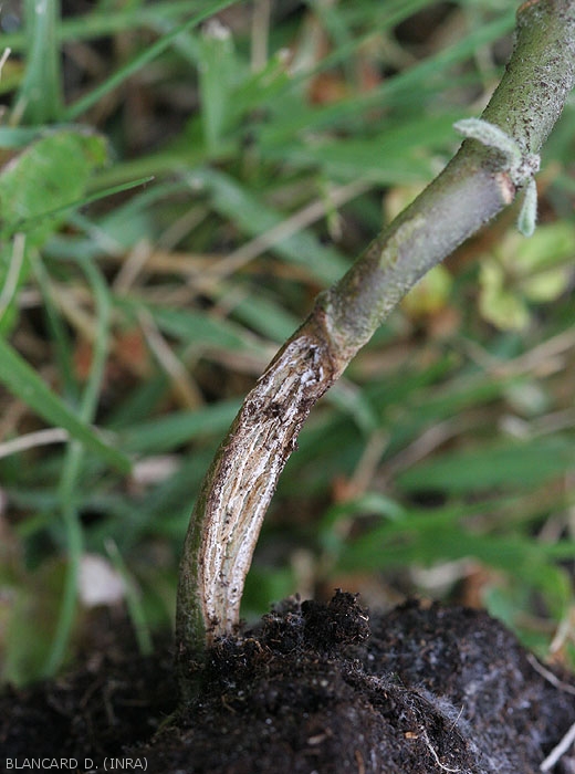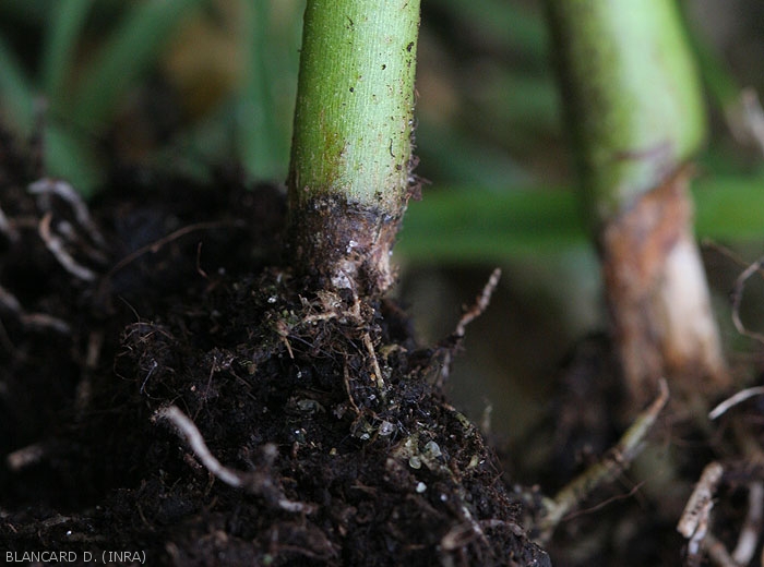 Deux taches elliptiques et contigües sont visibles sur cette tige de baselle.    <i>Rhizoctonia solani</i>  (Rhizoctone foliaire - web-blight)