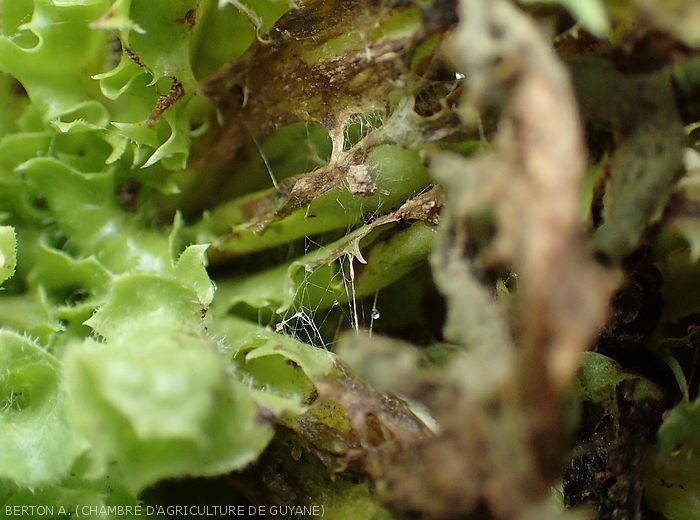 Le mycélium de<i>Rhizoctonia solani</i>, s'est abondamment développé par endroits sur le limbe de cette feuille de chou chinois.  ce qui est plutôt inhabituel ! (Rhizoctone foliaire - web-blight)