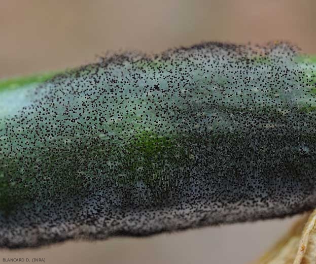 Soulignons que les organes atteints se couvrent d'une moisissure noirâtre plutôt aérienne (figure 5). Des fructifications en forme de petites têtes épingles apparaissent progressivement. D'abord blanche, elles brunissent et révèlent à terme une couleur pourpre-noire et un aspect luisant (figures 6 et 7).