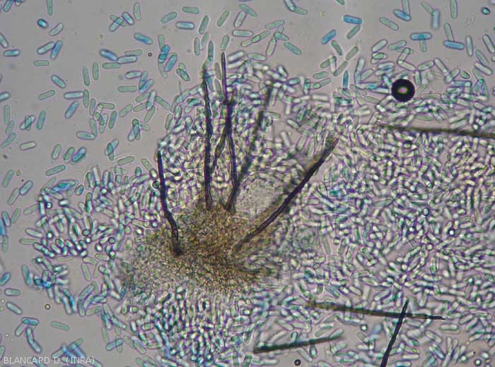 - forma asessuata o anamorfa in origine di acervuli superficiali sottocuticolari disposti a cerchio sugli array (1, 2 e 7). Questi acervuli contengono numerosi conidiofori che formano conidi ialini la cui forma o le cui dimensioni variano a seconda della specie prevalente * (figure 3, 4 e 8). Costituiscono il muco e più o meno color salmone visibile sugli acervuli (Figure 5 e 6). Di seta bruna con tubo da stufa nero e (7 e 8), le sete sono visibili anche all'interno di 've acervuli.