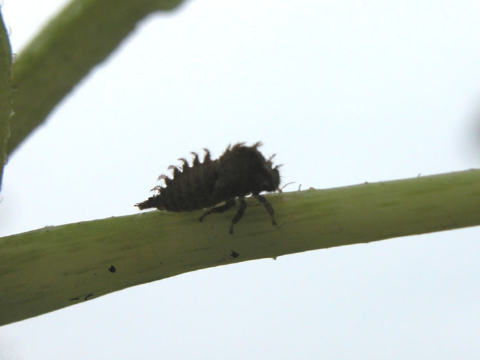- La larva è grigio-bruna, tondeggiante e appiattita lateralmente, con uncini provvisti di spine lungo la sommità del dorso (Figura 4).