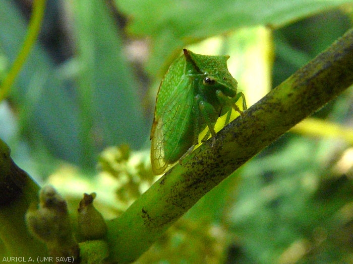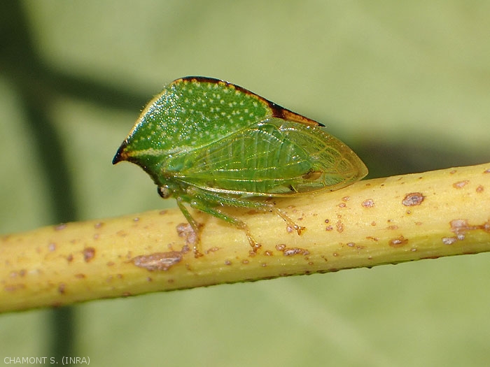 - L' adulto, che misura da 6 a 10 mm, è di colore verde con un pronoto molto sviluppato che forma due corna triangolari. La cresta dorsale è un po' più corta del corpo e non copre completamente le ali. Visto di lato, questo scafo verde è convesso e termina a punta. Il pronoto è punteggiato da puntini bianchi. Gli occhi sono in posizione laterale a causa dell'allargamento della testa. Le ali sono trasparenti (figure da 1 a 3). La femmina ha una lunga e potente coclea retrattile e un oviscaptor a forma di lama di coltello.
