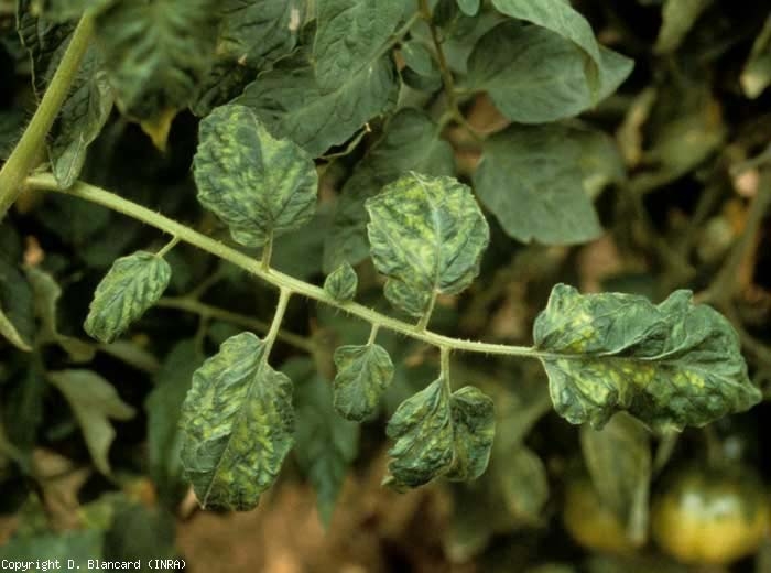 D'autres virus sont surtout responsables de mosaïques (Eggplant mottled dwarf virus, EMDV ou Pepino mosaic virus, PepMV) ou de chloroses foliaires (Tomato chlorosis virus, ToCV).