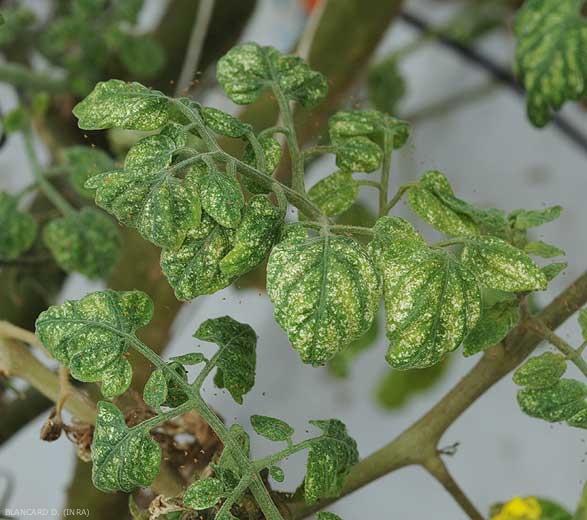 Sopra e sotto la lamina delle foglioline di pomodoro compaiono minuscole macchie clorotiche più o meno disperse (figure da 1 a 5). Quest'ultimo diventa gradualmente giallo e assume un colore spento (figure 3) . Tali macchie sono visibili anche sul fusto (figura 6) e sui piccioli, ma anche su alcuni frutti (figura 7).