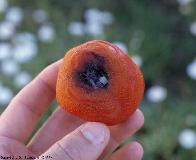 Des symptômes peuvent apparaître sur les autres organes de la tomate, en particulier sur la Tige au niveau du sol ou plus en hauteur, à partir des plaies de taille. Dans ce dernier cas, des lésions brun sombre, humides, s'étendent et ceinturent progressivement la tige (figure 4), condamnant à terme la partie distale de cette dernière. Alors, les feuilles ne tardent pas à jaunir, flétrir et se dessécher. D. lycopersici s'installe souvent sur les fruits à partir de la cicatrice pédonculaire. Une lésion brunâtre et circulaire s'étend assez rapidement. Les tissus ont tendance à s'effondrer légèrement et à noircir, ceci du fait de la colonisation de la chair par le mycélium mélanisé du champignon, et par la formation de nombreuses fructifications (figure 5). En effet, quelque soit l'organe attaqué, de minuscules structures globuleuses et noires sont visibles sur les tissus lésés. Ce sont les pycnides issues de la reproduction asexuée de ce champignon (figures 6 à 8) (voir aussi les symptômes observés sur Collet).