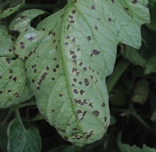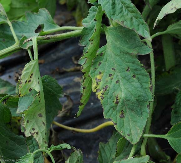 Sintomi sulle foglie di ticchiolatura batterica causati da Xanthomonas spp. sono del tutto paragonabili a quelli descritti per Pseudomonas syringae pv. pomodoro : lesioni piccole, grasse e traslucide che compaiono casualmente sulle foglioline o sul bordo della lamina fogliare e che successivamente danno luogo a macchie da marroni a nere (figure da 1 a 3). Sono circolari o leggermente angolari, con un diametro di 2-3 mm, e talvolta aureole di un alone giallo (figura 4). Il loro centro si asciuga e i tessuti degradati possono eventualmente cadere. In presenza di umidità, queste macchie possono diffondersi e fondersi, alterando ampie aree della lama che alla fine si necrotizzano e si seccano . In alcuni casi, le foglie intere ingialliscono, si seccano; possono rimanere attaccati alla pianta o cadere. Le foglie giovani sono spesso più sensibili.