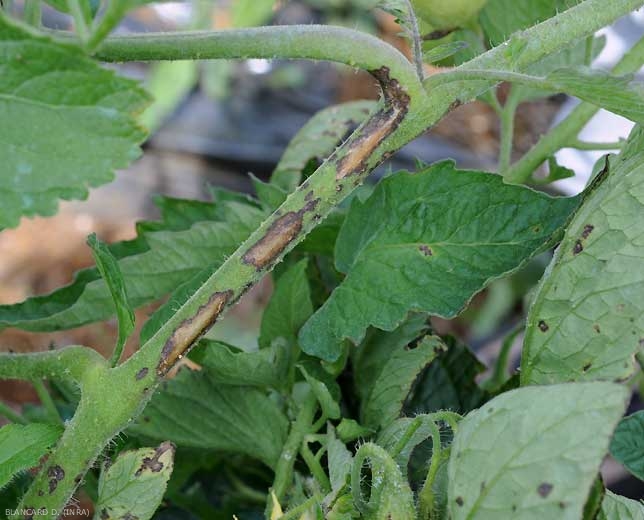 Di lesioni comparabili sono visibili sugli altri organi, in particolare il picciolo (Figura 5), il fusto (Figura 6), i fusti ei sepali frutti (Figura 7). Sono spesso più estese e allungate rispetto alle foglioline. Quando sono presenti sui pedicelli dei fiori, alcuni fiori possono cadere.