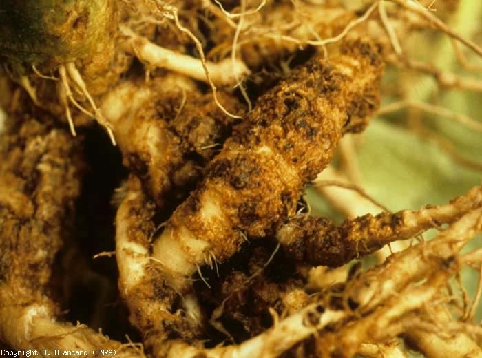 Spongospora subterranea è responsabile di pustole bianche che rapidamente in tumori che si crescono formano sulla superficie delle radici . Diventano gradualmente marroni e diventano superficialmente sughero (Figure 1 e 2).