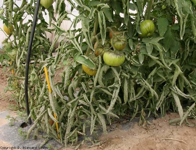 Il sintomo dell'arrotolamento delle foglie può manifestarsi su giovani piante prodotte al coperto e poste in campo durante i periodi umidi. Si osserva generalmente più tardi, su piante con almeno 3 mazzi e nel periodo estivo. Ad essere colpite sono innanzitutto le foglie inferiori delle piante coltivate in pieno campo e, in misura minore, al riparo. Le lamelle delle foglie si curvano gradualmente verso l'alto e talvolta inesorabilmente (Figure 1 e 2); alla fine, i bordi opposti della lamina fogliare si incontrano e le foglioline finiscono per essere completamente arrotolate su se stesse (figure 3 e 4). Alla fine, i tessuti sono spesso più spessi, croccanti e lucenti. In alcune situazioni particolarmente gravi, viene colpita un'elevata percentuale di foglie, conferendo alle piante un aspetto particolare.