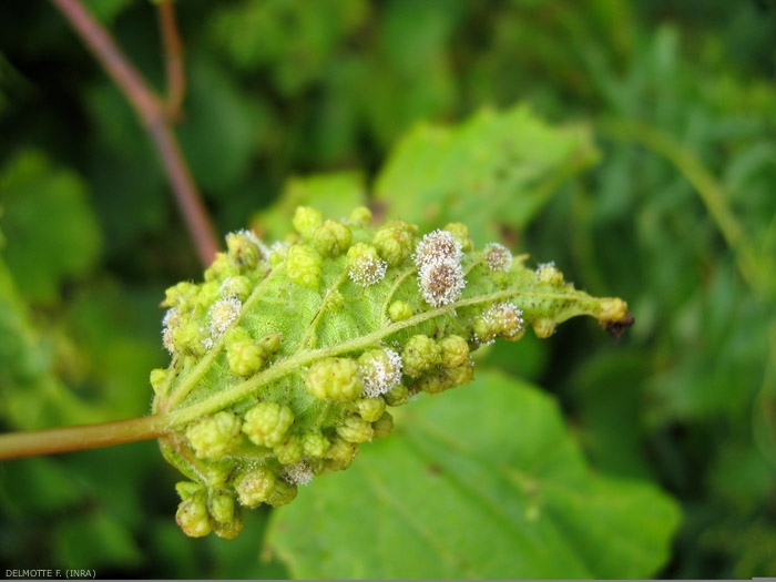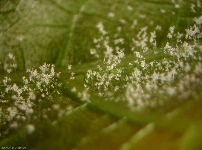 Sulla maggior parte degli organi colpiti, P. viticola forma arbuscoli che emergono attraverso gli stomi: gli sporangiofori, al termine dei quali si producono sporangi (figura 6). Queste strutture, quando sono numerose, costituiscono l'infeltrimento bianco spesso associato ai sintomi della peronospora sugli organi della vite (Figure da 7 a 9). Questi sporangi sono principalmente diffusi dal vento quando l'umidità dell'aria diminuisce. Potrebbero essere dovuti a schizzi che si verificano durante forti piogge.