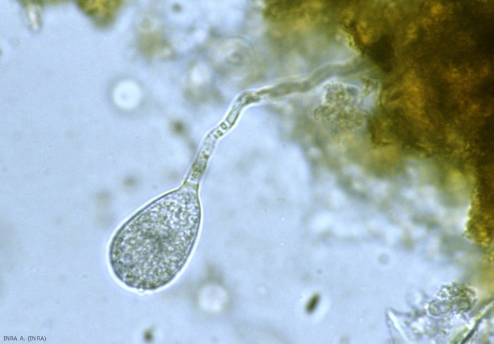 In Francia la Plasmopara viticola può essere conservata solo grazie alle sue oospore (figura 1), o uova invernali, che si formano a fine stagione nei tessuti della peronospora: rametti giovani, bacche, ma più in particolare le foglie colpite da muffa del mosaico. "(Figura 2). Questi ultimi, presenti sul terreno o accumulati in alcuni punti dell'appezzamento o nel suo ambiente, assicurano quindi indirettamente la sopravvivenza di questo cromista durante l'inverno. In primavera, quando le temperature si fanno più miti, le uova germinano in 2 giorni, o anche più di una settimana a seconda della temperatura. Appare un filamento germinale alla cui estremità si forma un macroconidio piriforme (Figure 3 e 4). Successivamente, questa struttura dà origine a diverse dozzine di zoospore con 2 flagelli che consentono loro di muoversi nell'acqua. Questi assicurano le contaminazioni primarie in primavera e rimangono mobili per circa trenta minuti per raggiungerlo. Aggiungiamo che gli sporangi possono talvolta germinare ed emettere direttamente un tubo germinale.