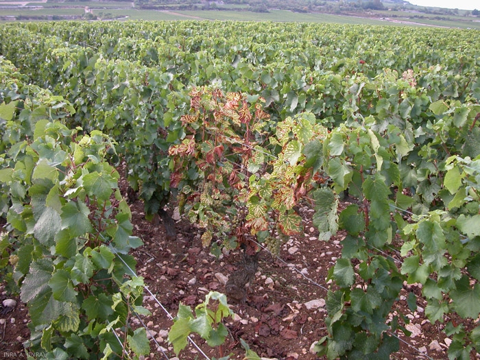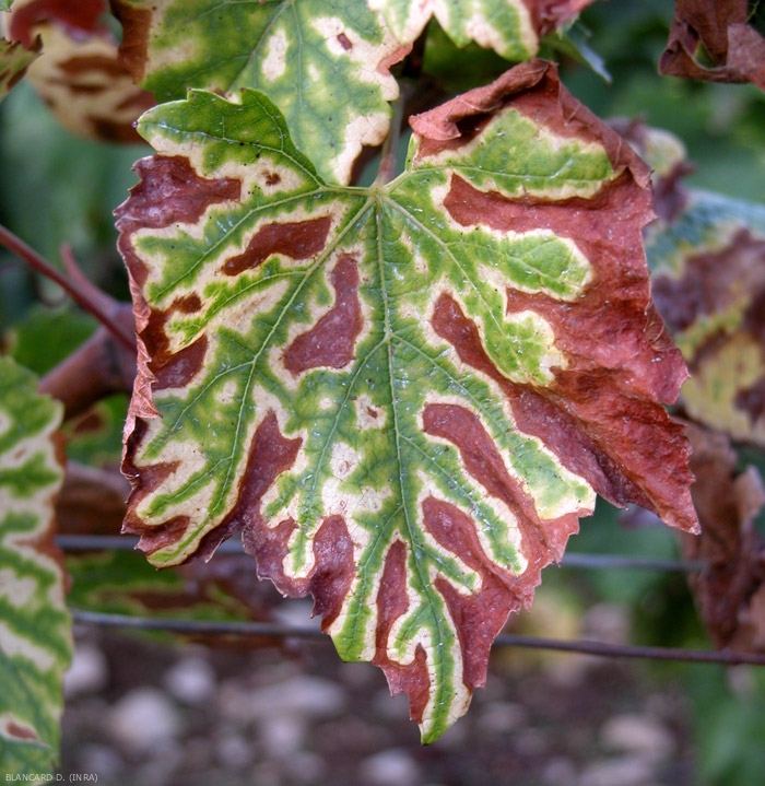 - Una forma lenta caratterizzata da macchie variabili delle foglie, la lama di prendere una tinta gialla o rossa sulle varietà a bacca bianca, e giallo su vitigni neri (figure da 3 a 5). Queste decolorazioni possono essere accompagnate da lesioni fogliari necrotiche che formano digitazioni intravenose che causano l'aspetto tabby delle foglie. (Immagini). Se questi ultimi sono gravemente colpiti, possono seccarsi completamente e staccarsi dai ramoscelli.
