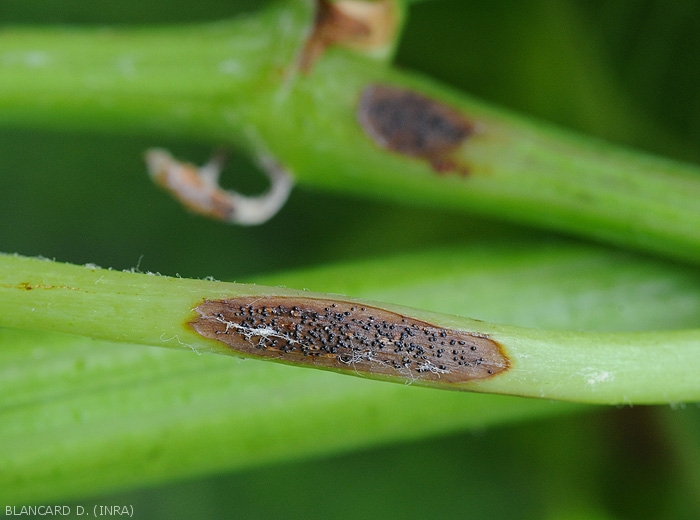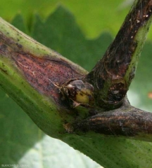 Macchie allungate e depresse sono visibili anche sui piccioli, sui peduncoli racemi e sui viticci (Figura 6); sono clorotiche con centro nero. Durante la loro estensione, i tessuti infetti diventano marrone-nero e si ricoprono di picnidi. I giovani rametti, (Figure 7 e 8) colpiti meno frequentemente, mostrano lesioni cancerose comparabili di lunghezza variabile da pochi millimetri a più di 2 cm. I picnidi si formano facilmente su queste lesioni (Figura 9).
