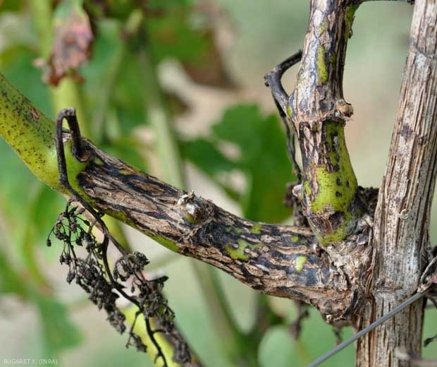 Le lesioni compaiono sui primi internodi alla base dei giovani germogli, spesso a livello delle lenticelle. Sono di taglia contenuta, di forma allungata, e inizialmente di colore scuro (figura 1); diventano marroni e nere mostrando successivamente riflessi bluastri (Figura 2). Queste lesioni necrotiche diventano frequentemente cancelleria, i tessuti centrali della corteccia si assottigliano e si screpolano più o meno in larghezza (Figure 3-7). Quest'ultimo fenomeno si amplifica durante un periodo di rapida crescita della vite. Simili lesioni si possono osservare sui piccioli e sui peduncoli di infiorescenze e racemi. Questi possono portare al deperimento del grappolo, che poi non viene più nutrito, o debolmente (figura 8).