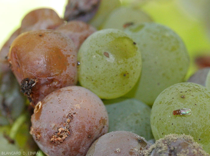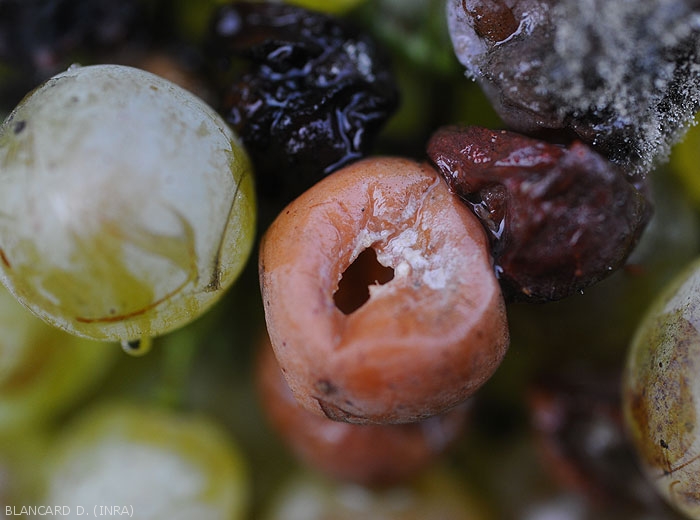 L' acido putrefattivo inizia frequentemente vicino allo stelo attacca baie oa varie lesioni. I tessuti alterati assumono poi un colore che varia a seconda dello stato di sviluppo del marciume e dei vitigni. È piuttosto marrone chiaro sulle varietà bianche (figure da 1 a 7) e dal viola al rossastro sulle varietà rosse (figure da 8 a 10). Una volta avviato, il marciume si diffonde abbastanza rapidamente all'intera bacca che, di regola, mantiene la sua forma. La sua buccia si indebolisce gradualmente e il succo scorre, conferendo un aspetto lucido agli acini adiacenti situati sotto. Più raramente si osservano masse mucose biancastre in seguito alla formazione di colonie di lieviti (figura 5). Questi grappoli non vanno confusi con le tante uova che i moscerini della frutta depongono sulle ferite delle bacche marce. Alcuni cluster possono essere completamente interessati (Figura 11).