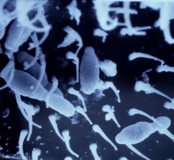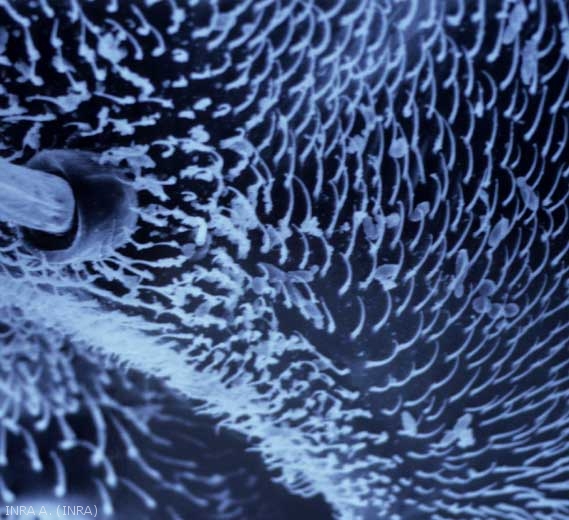 La vection dei moscerini della frutta adulti può avvenire in due modi: o per la presenza di propaguli sulla superficie del corpo dell'insetto, o eventualmente all'interno della loro coltura. Infatti, le osservazioni al microscopio elettronico a scansione (Figure 5 e 6) consentono di osservare la presenza di cellule di lievito su alcune parti del corpo dell'insetto, come il torace e le zampe ( K. apiculata viene sistematicamente rilevato e C. stellata è molto comune). Tuttavia, questi propaguli sono più rari sulla testa, sull'addome o sulle ali. Un inventario della micoflora della coltura di questi insetti rivela 2 specie dominanti: K. apiculata e C. stellata , ma anche più occasionalmente P. membranifaciens , M. pulcherrima , Candida krusei , e vari funghi come Botrytis cinerea o appartenenti al generi Rhizopus , Penicillium . Aggiungiamo che le cellule dei lieviti in particolare potrebbero essere espulse vive dopo il transito intestinale.
