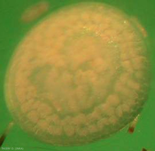 - Le uova della Lobesia botrana sono abbastanza simili a quelle della cochylis. Hanno la forma di una lente e vengono posati isolati (Figura 1), quindi incollati alla superficie della baia. La distinzione tra le uova dei due vermi però è attendibile solo dopo pochi giorni di incubazione. Le uova di eudemis sono beige, leggermente iridescenti (figura 2).