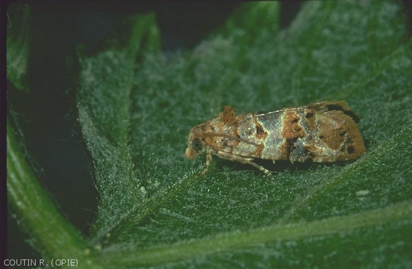 - Gli adulti (figure 9 e 10) misurano da 10 a 13 mm di apertura alare. La loro colorazione è complessa, con le ali anteriori grigio perla punteggiate da piccole aree bruno rossastre con 3 bande leggermente oblique: una alla base, una al centro dell'ala allargata al suo centro ed un apicale piuttosto scuro delimitato da una zona più chiara.