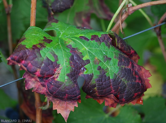 La decolorazione inizia alla periferia del lembo fogliare, è di forma squadrata ed è delimitata dalle nervature. La lama tende ad arricciarsi leggermente. Successivamente le foglie diventano necrotiche e si seccano.