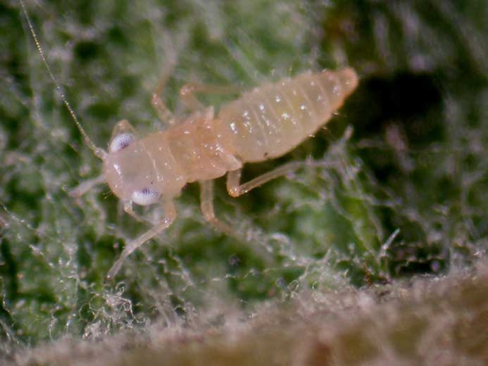 - La larva da cova passa attraverso 5 stadi larvali differenziati per la taglia e la forma degli individui oltre che per lo sviluppo delle ali. Le larve di primo stadio sono bianche, piccole e prive di ali. Durante gli stadi successivi le larve virano al verde, a volte rossastre, e dal penultimo stadio presentano contorni di ali ben sviluppate. Si muovono rapidamente "a granchio" (obliquamente) e si trovano nella parte inferiore delle foglie.
