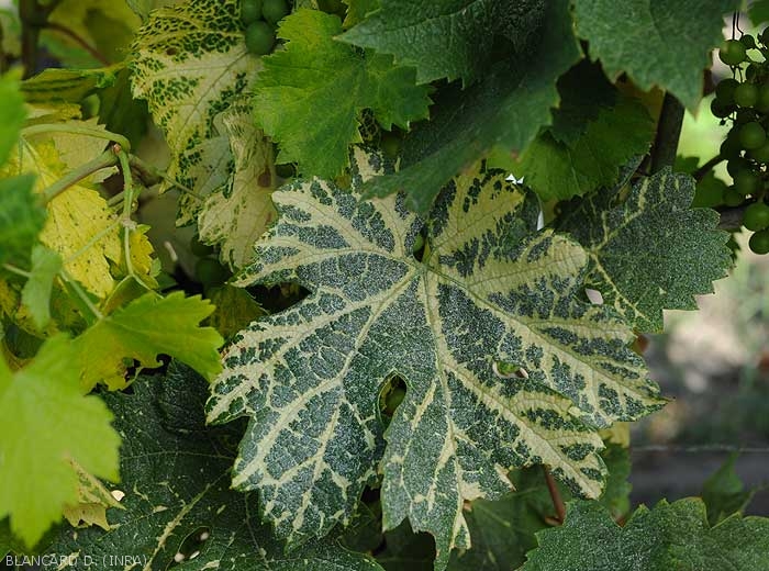 Le foglie che crescono sulle viti malate mostrano varie anomalie nel colore e nella forma. Si possono quindi osservare variegature o mosaici di colore giallo dorato localizzati inizialmente lungo le nervature per poi generalizzare a tutto o parte del lembo fogliare.