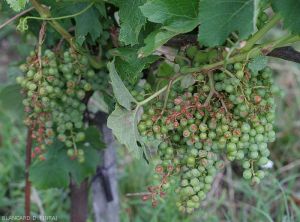 Le scottature solari sono abbastanza comuni nelle piante, come nelle viti. Compaiono sulle parti erbacee a temperature superiori a 42°C, ed in particolare sugli organi solitamente ombreggiati. Si possono così osservare disseccamenti parziali delle foglie , la cui lamina diventa bruna e si necrosi su aree più o meno estese. Sugli acini è essenzialmente il lato più esposto al sole ad essere colpito. Quindi, una lesione bruno-rossastra appare su un lato del frutto, successivamente l'intera bacca può seccarsi. Se lo stress è elevato, l' cluster intero è interessato.