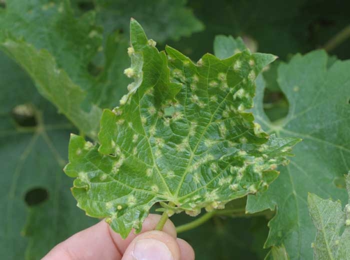 Daktulosphaira vitifoliae è responsabile di sintomi che di solito non sono letali sui vitigni americani. Le galle provocate dalle punture di questo insetto sono visibili sulla pagina inferiore delle foglie (Figure da 1 a 4), sebbene lesioni clorotiche siano visibili sulla lamina fogliare (Figure 5 e 6) Sono presenti durante tutta la fase di crescita attiva. vite, e sono di colore verde-rossastro. Le foglie colpite hanno spesso una crescita ridotta che si traduce in una cattiva crescita del legno. In caso di forte infestazione, le larve possono depositarsi sulle altre parti erbacee della pianta (piccioli, viticci).