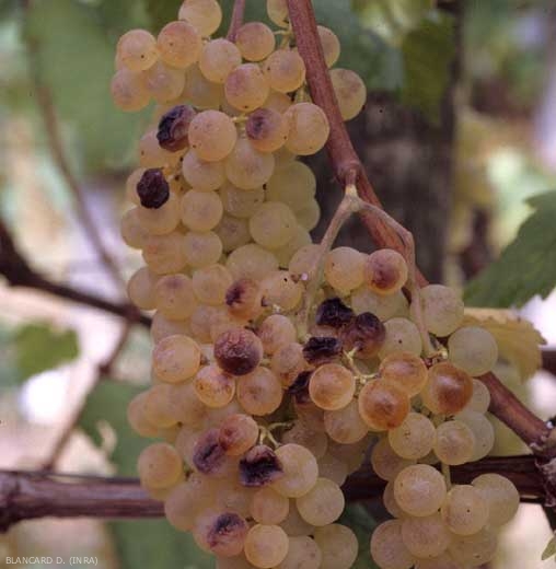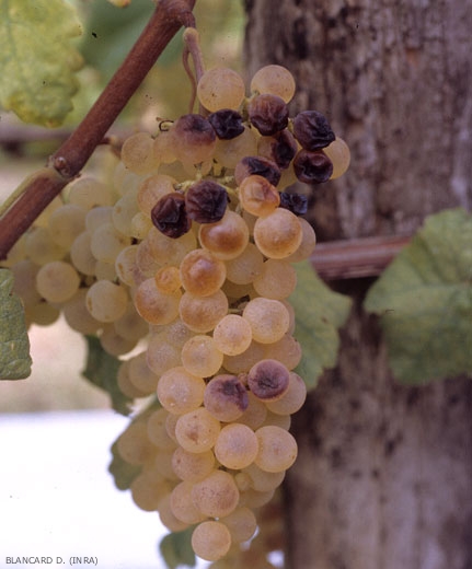 Sugli acini d'uva invasi da Alternaria spp. . Queste alterazioni sono spesso avviate nella zona pedicellare degli acini, sono di colore da rossastro a marrone chiaro all'inizio dello sviluppo (a seconda del vitigno) e successivamente si scuriscono gradualmente (figure da 1 a 3).