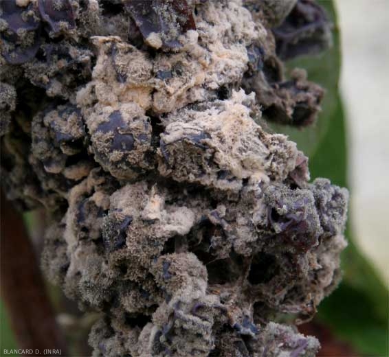 Questo fungo sporula abbondantemente sulla superficie delle bacche marce ricoperte da muffe grigie di B. cinerea (Figure 1). I suoi conidi vengono dispersi dalle correnti d'aria e/o dagli spruzzi d'acqua in seguito alle piogge.