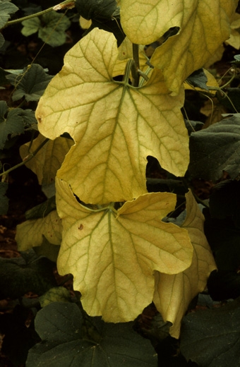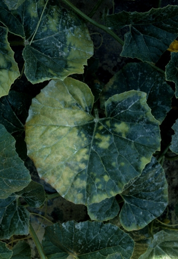 - divers virus : le virus de la mosaïque du concombre (CMV, figure 1), le virus de la mosaïque de la courge (SqMV), le virus de la mosaïque jaune de la courgette (ZYMV, figure 1), le virus type 2 de la mosaïque de la pastèque (WMV2), le luteovirus du melon, le virus de la jaunisse du melon (MYV, figure 2),