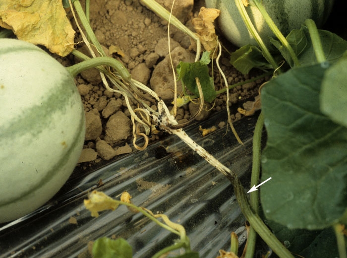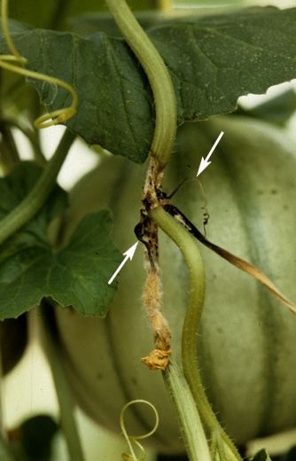 Le champignon Sclerotinia sclerotiorum peut former du mycélium blanc dense et de gros sclérotes noirs en surface, rarement dans la moëlle, au niveau des plaies de taille ou des tissus sénescents présents sur les tiges. Il peut aussi entraîner des symptômes sur les fruits. Les cultures sous abri sont les plus affectées. Cette maladie est assez courante en France, surtout lorsque le melon entre en rotation avec la salade.