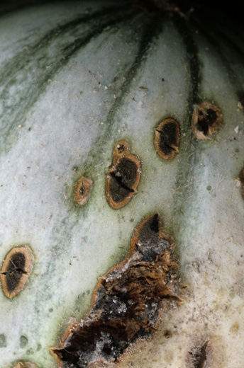 Dans le cas de la Cladosporiose, la formation de tissus cicatriciels liégeux en bordure des taches, notamment sur Melon et sur Courgette, leur confèrent par la suite un aspect tout à fait particulier. La presque totalité des variétés de Concombre cultivées en France sont résistantes à cette maladie, aussi il est peu fréquent d'observer les petites taches graisseuses et gommeuses (se couvrant parfois d'un duvet gris vert) caractéristiques de la Cladosporiose sur fruit de Concombre.