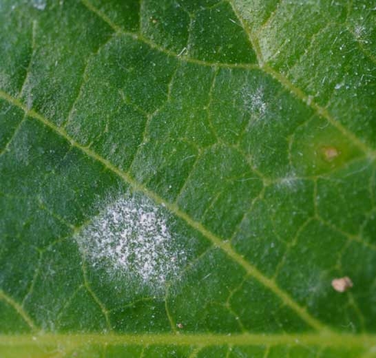 Des taches poudreuses à duveteuses, circulaires et blanches, apparaissent sur les feuilles* (figure 1). Habituellement, elles se développent plutôt sur les vieilles feuilles, les plus basses et les plus ombragées. Ces taches se multiplient, confluent (figures 2 et 3), et couvrent finalement progressivement les faces supérieure et inférieure du limbe entraînant la sénescence prématurée des feuilles. Elles sont en fait constituées par le mycélium et les conidiophores des champignons à l'extrémité desquels se forment des conidies en chaînes (figure 4). A terme, les feuilles entièrement oïdiées, donnent l'impression d'être couvertes de talc (figure 5) ; elles jaunissent, se nécrosent plus ou moins avant de se dessécher et se ratatiner. Les plantes vieillissent prématurément et lorsque les attaques sont précoces et sévères, celles-ci ont une croissance plus limitée.