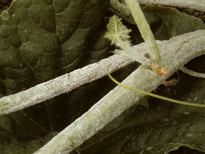 Les pétioles, les tiges peuvent aussi être affectés par l'oïdium (figures 8 et 9), les fruits le sont beaucoup plus rarement, voire jamais pour certaines espèces, ceci malgré de fortes attaques sur le feuillage. Les fruits peuvent tout de même présenter une croissance réduite. Ajoutons que lorsque de nombreuses feuilles ont été détruites, ils sont plus exposés aux brûlures solaires et montrent donc des lésions superficielles sur une de leur face. Sur melon, on peut parfois observer des attaques sur jeunes fruits (figure 10), à l'origine par la suite de cicatrices liégeuses et de déformations.