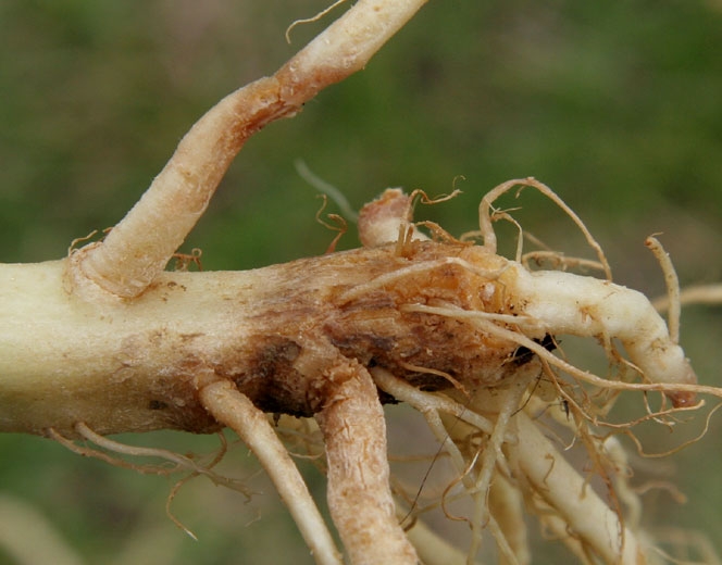 Les plantes affectées sont souvent peu développées et chlorotiques. Elles flétrissent parfois durant les journées chaudes.