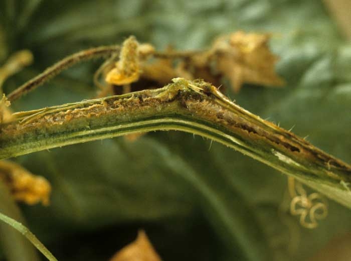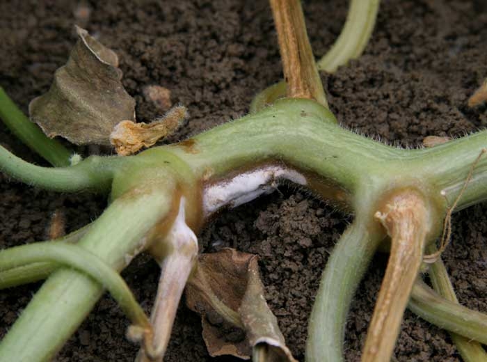 La tige présente d'abord un brunissement superficiel et unilatéral plus ou moins discontinu (figure 8). Des exsudats gommeux perlent par endroits ; ils brunissent rapidement en s'oxydant (figures 9 et 10). Assez vite, une altération nécrotique chancreuse et brunâtre se développe sur plusieurs centimètres de long. Plate et localisée sur un coté de la tige, elle apparaît tandis que les tissus touchés se dessèchent. En fin d'évolution, F. oxysporum f. sp. melonis peut fructifier sur les lésions, sous forme d'un dense feutrage blanc mât à rosé (figure 11).