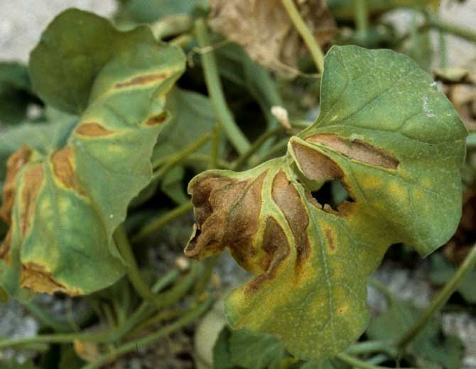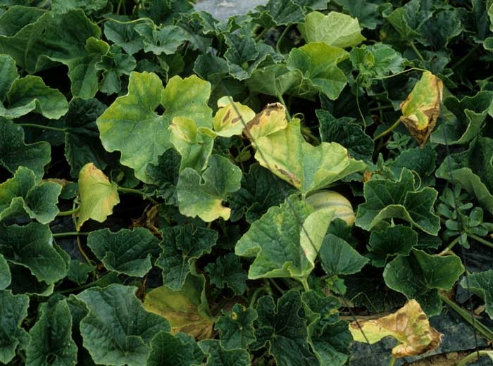 Sur melon, les plantesaffectées montrent fréquemment un discret flétrissement des feuilles les plus basses aux moments les plus chauds de la journée. Dans un premier temps, ce flétrissement est réversible au cours de la nuit et parfois limité à un seul "côté" de la plante. Par la suite, au fur et à mesure du développement de la maladie, on peut constater que certains secteurs du limbe, souvent internervaire et en forme de « V », se ramollissent et jaunissent progressivement (figures de 1 et 2). Des portions importantes des feuilles finissent par prendre une teinte beige à brune, puis se nécroser et se dessécher (figure 3). Les feuilles ainsi touchées meurent éventuellement de façon prématurée, ce qui entraîne une exposition des fruits au rayonnement solaire et donc des risques de brûlures solaires. Des chutes de feuilles ont été observées sur melon en Tunisie.