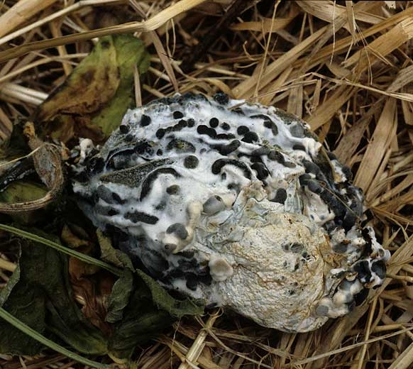 Du mycélium plus ou moins cotonneux et blanc se forme sur tous les tissus affectés (figures 2, à 5, et 7), ainsi que de grosses structures irrégulières noires, plutôt allongés, mesurant 2-20 mm x 3-7 mm : des sclérotes (figures 5 et 8 à 11).