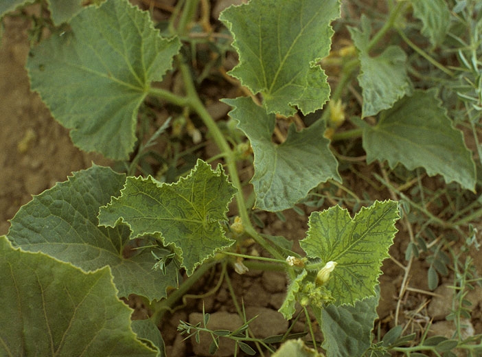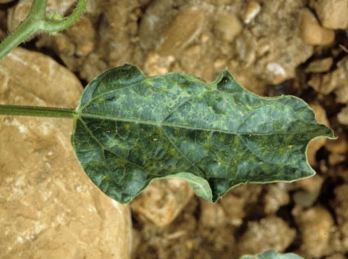 Chez le concombre : Certaines souches infectent le concombre en provoquant une mosaïque et des taches chlorotiques ou en anneaux sur le feuillage.