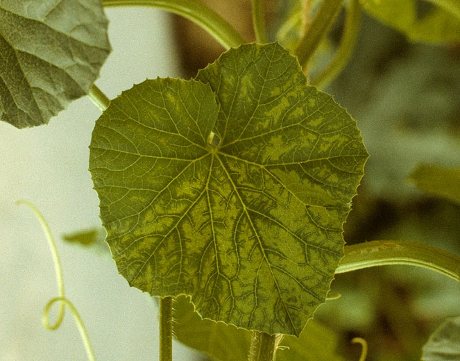Chez le melon, le virus de la mosaïque de la courge (SqMV) induit une mosaïque sur feuilles plus ou moins forte souvent accompagnée d'une décoloration internervaire, ce qui confère au limbe un aspect caractéristique dénommé par les anglo-saxons "vein-banding" (figures 1 à 3). Des taches en anneaux peuvent aussi être observées. Parfois les symptômes sont beaucoup plus accentués et on peut assister à de fortes déformations des feuilles (figure 4) qui prennent alors un aspect en "feuille de chêne" (figure 5).
