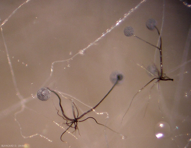 Le mycélium du champignon envahit les tissus, et une moisissure blanchâtre à grisâtre les recouvre par la suite (figures 2, 3 et 5). Elle est constituée par le mycélium, les sporocystophores et les sporocystes de ce zygomycète. À terme, de nombreuses fructifications assez aériennes, en « têtes d'épingle noires », sont visibles sur les tissus lésés (figure 6).