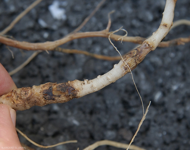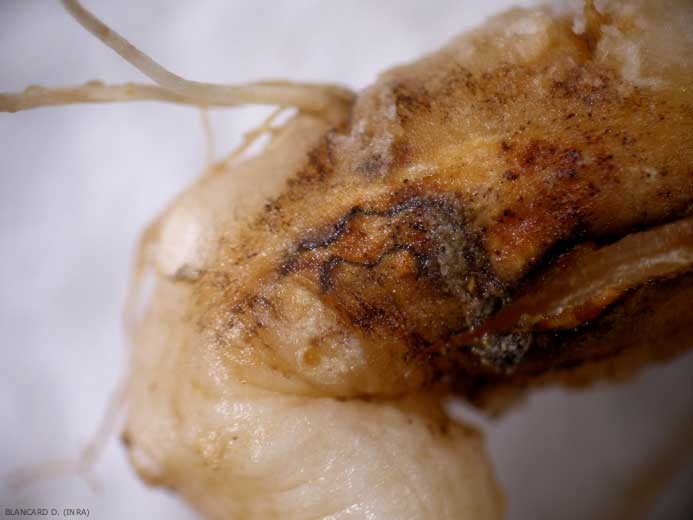 Sur les lésions racinaires, des lignes noires sont observées localement (pseudo-stromas) (figure 8), plus ou moins épaisses et aux contours irréguliers entourant des plages de tissus. Sur certaines portions, on discerne parfois plus difficilement de nombreuses ponctuations noir grisâtre à brun réparties en « mosaïque » en place dans les cellules du cortex. Ce sont les pseudo-microsclérotes (figures 9 et 10) de ce champignon.