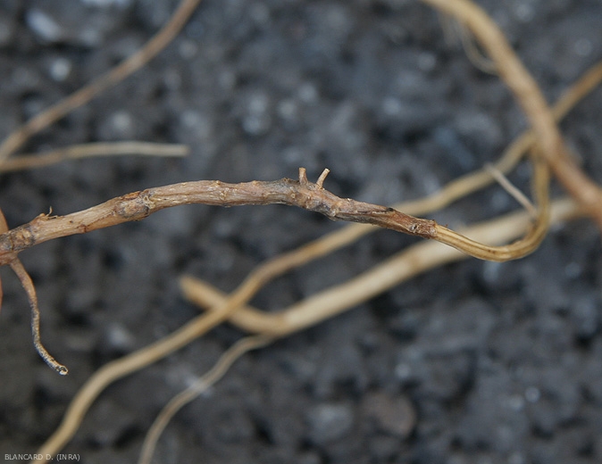 Après avoir arraché et lavé soigneusement les systèmes racinaires de quelques plantes malades, on constate qu'ils sont plus ou moins altérés (figures 1 à 4), pourris, localement subérisés. Des racines ont disparues et celles qui subsistent montrent des lésions nécrotiques brun rougeâtre plus ou moins étendues (figures 5 et 6), certains sont plus ou moins liégeuses (figure 3, 4 et 7). Les tissus racinaires finissent par pourrir et se décomposer, ce qui fait qu'à terme les systèmes racinaires sont très réduits.