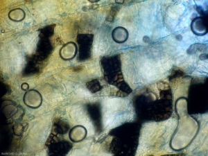 Sur les lésions racinaires, des lignes noires sont observées localement (pseudo-stromas) (figure 8), plus ou moins épaisses et aux contours irréguliers entourant des plages de tissus. Sur certaines portions, on discerne parfois plus difficilement de nombreuses ponctuations noir grisâtre à brun réparties en « mosaïque » en place dans les cellules du cortex. Ce sont les pseudo-microsclérotes (figures 9 et 10) de ce champignon.