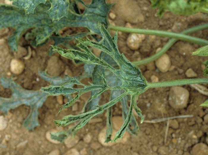Les premiers symptômes sur feuillage sont un éclaircissement des nervures (figure 2) et un jaunissement (figure 3) qui évoluent vite en mosaïque (figures 4 et 11). Les symptômes deviennent rapidement beaucoup plus sévères avec d'importantes déformations : boursouflures et cloques vert foncé (figure 5), feuilles en "lacet de chaussure" (filiformisme) (figures 6 et 7). Ces derniers symptômes peuvent aujourd'hui être confondus avec ceux produits par les souches sévères de WMV.