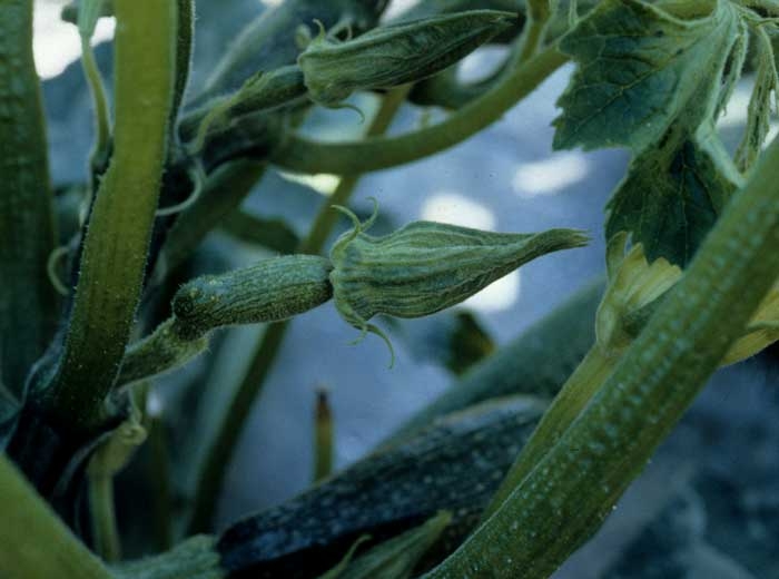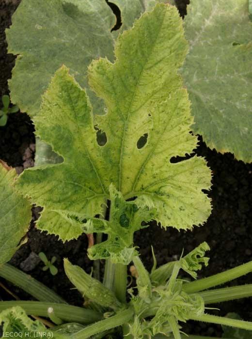 Le virus de la mosaïque de la courgette (Zucchini yellow mosaic virus, ZYMV), de par les nombreuses souches signalées dès la première description de ce virus, est à l'origine de symptômes assez différents. De plus, ceux-ci peuvent varier en intensité en fonction de la saison (ils sont généralement plus sévères en été), l'espèce ou la variété infectée. Notons que des symptômes plus accentués peuvent être observés en cas de co-infection avec d'autres virus (synergie), et en particulier avec le virus de la mosaïque du concombre (CMV). C'est probablement chez la courgette que le ZYMV provoque les symptômes les plus spectaculaires (figures 1 et 7), et c'est souvent chez cet hôte que ce virus a été signalé, initialement, dans de nombreux pays.