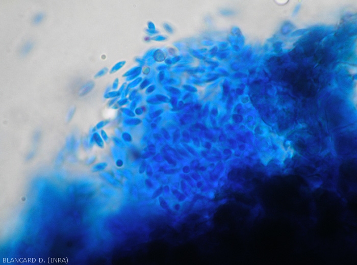 Aspect au microscope photonique de plusieurs pycnides de <b><i>Phomopsis vexans</i></b> formées sur des tissus altérés. Remarquez une ostiole présente sur chacune d'entre-elles et de nombreuses spores alpha.