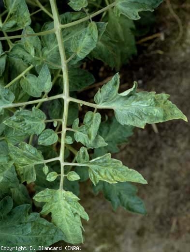 Une mosaïque plutôt chlorotique et légèrement déformante  est bien en place sur cette feuille de tomate. <b>Virus de la mosaïque te la tomate</b> (ToMV)